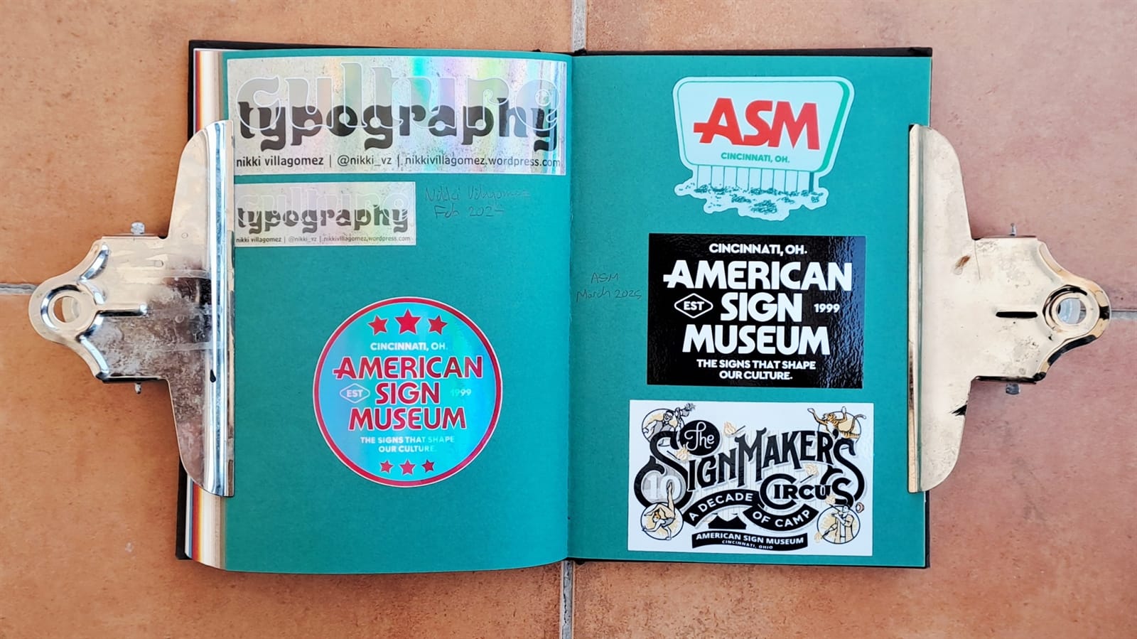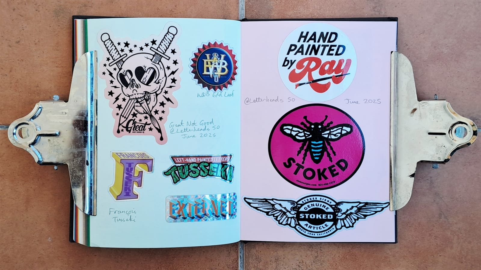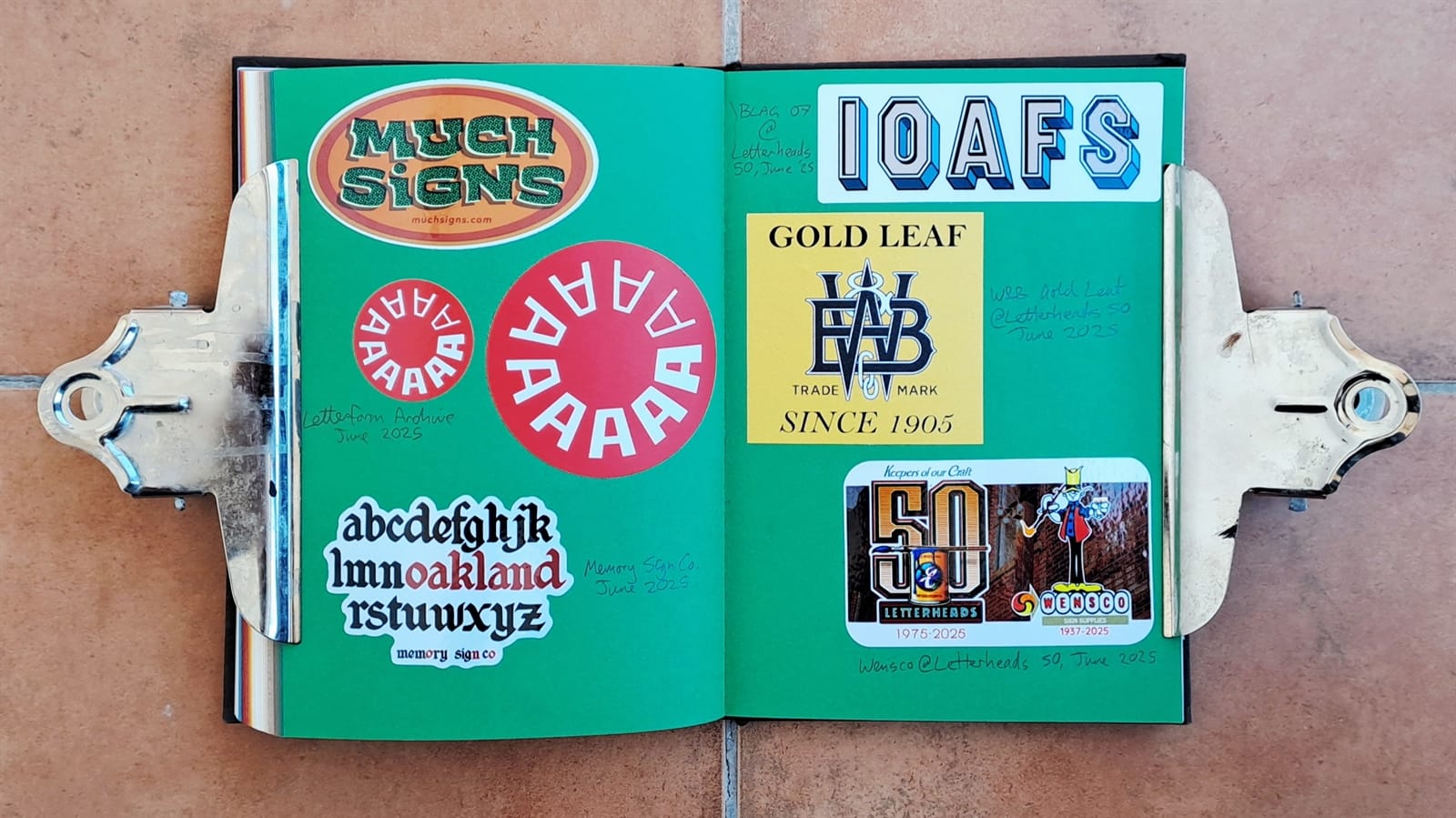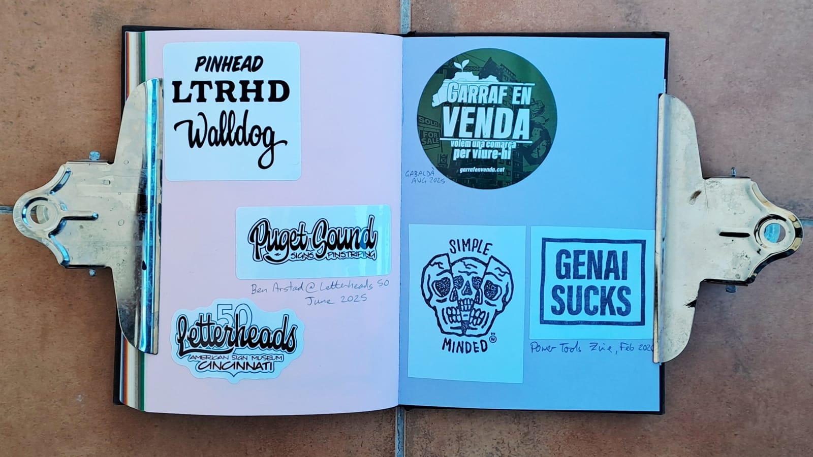 Final Letterheads 50 stickers from Puget Sound Signs (left), and two from the Power Tools zine (bottom right).One more Power Tools zine sticker and then the full sheet, plus bonus stickers, from Tom Vincentie, received last week.Next up is this spread (and six more after that) which I hope to have filled on my return from Letterheads 2026: Sea Level....