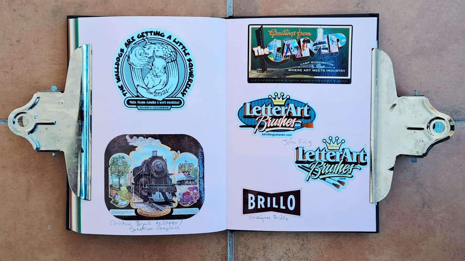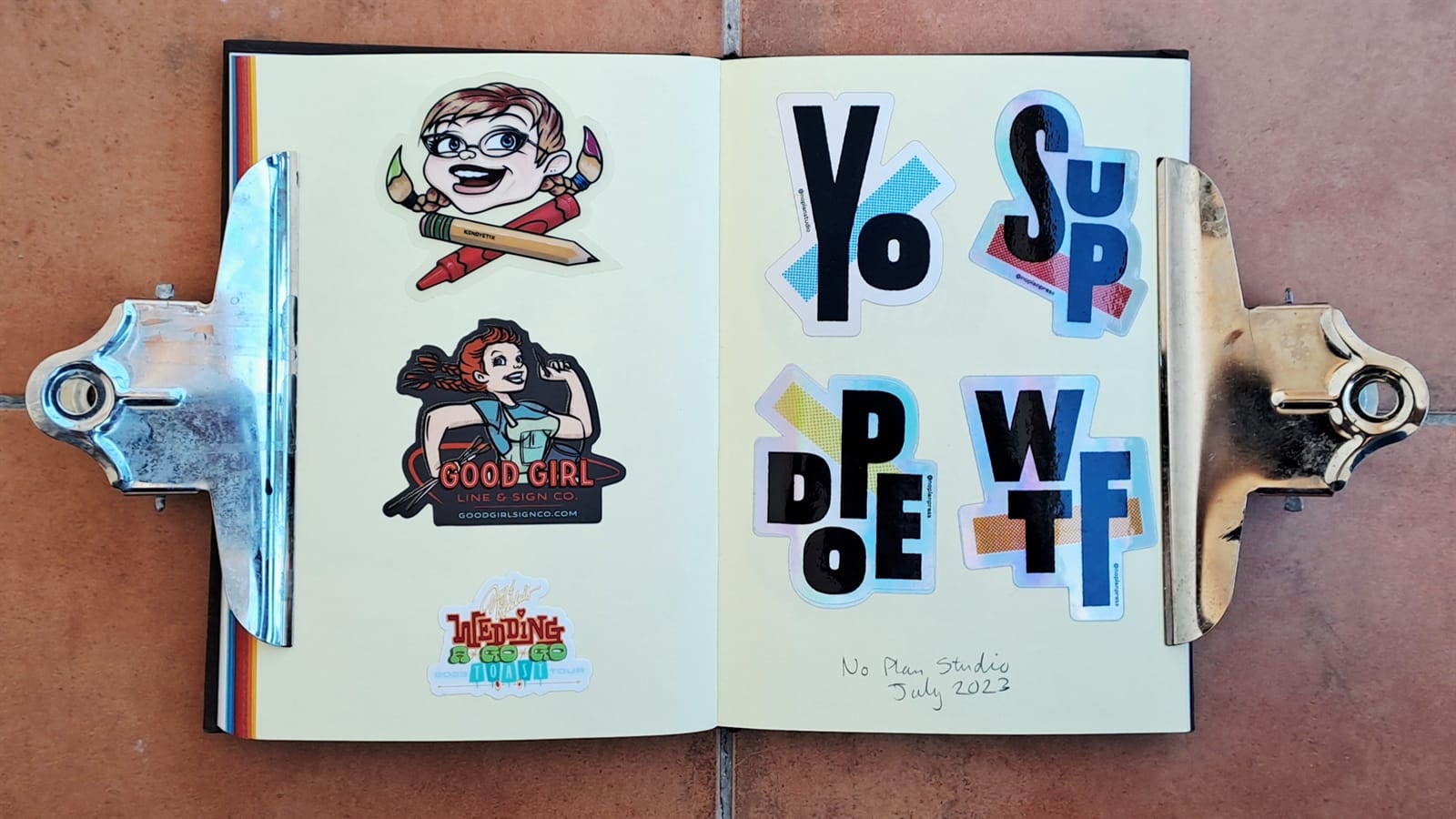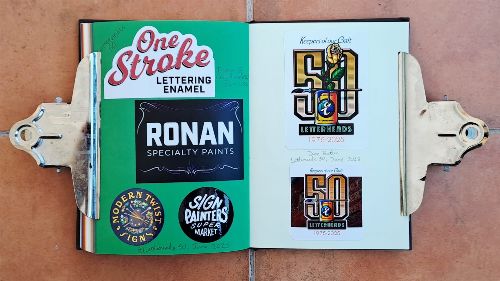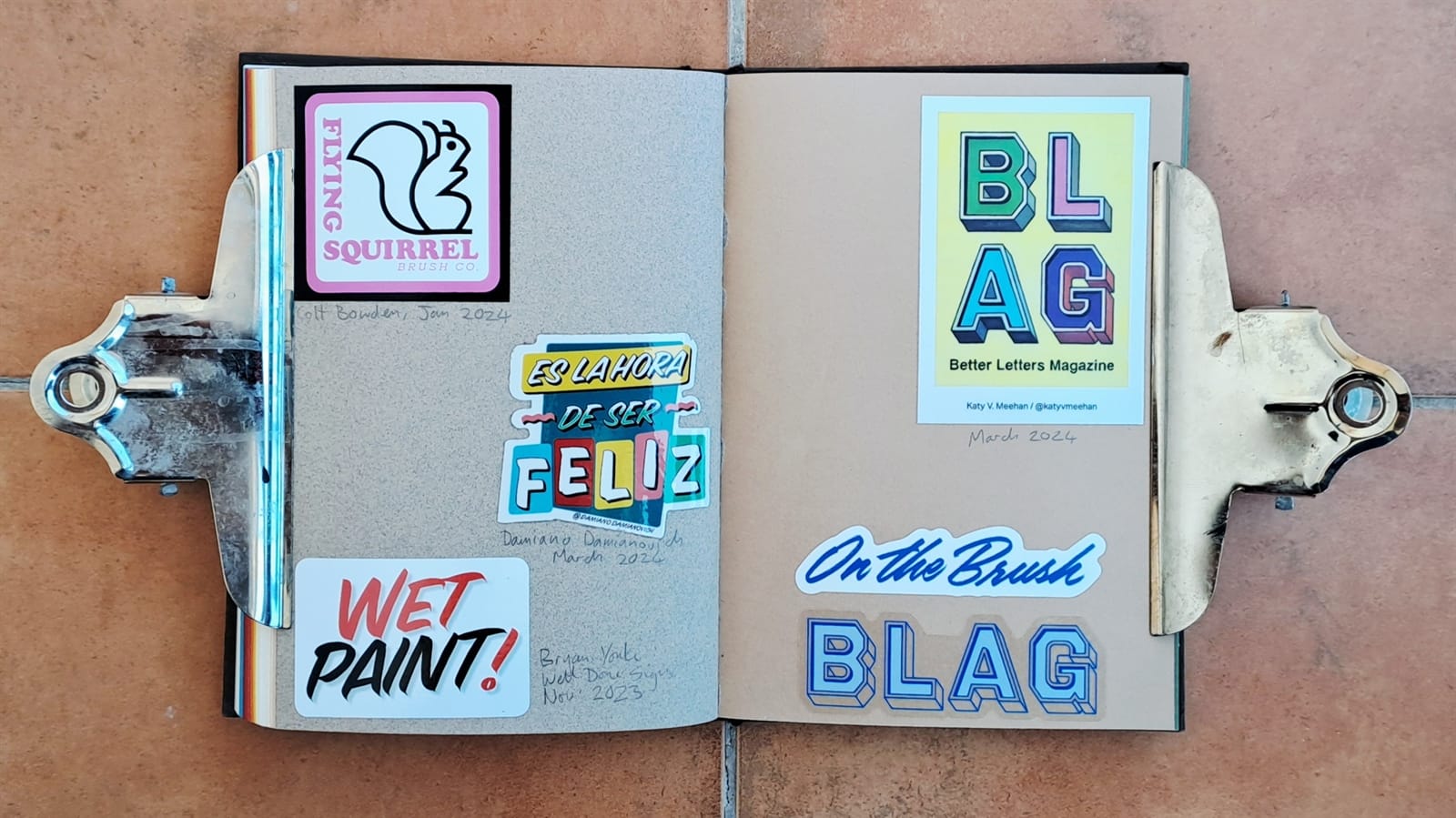 Final Letterheads 50 stickers from Puget Sound Signs (left), and two from the Power Tools zine (bottom right).One more Power Tools zine sticker and then the full sheet, plus bonus stickers, from Tom Vincentie, received last week.Next up is this spread (and six more after that) which I hope to have filled on my return from Letterheads 2026: Sea Level....