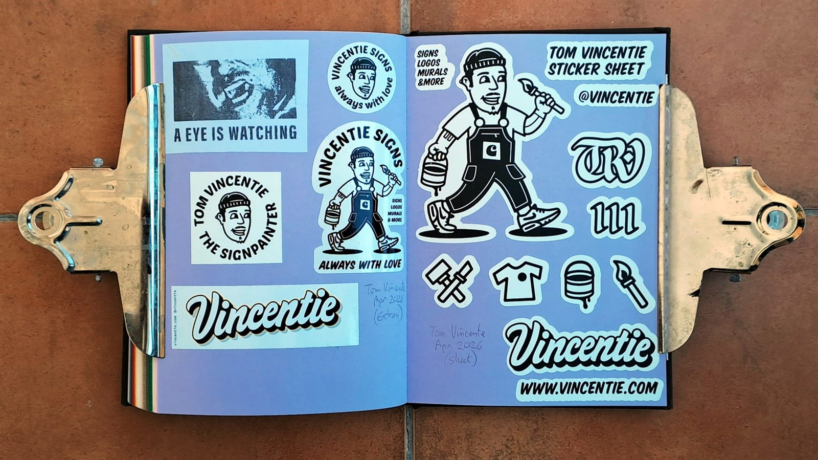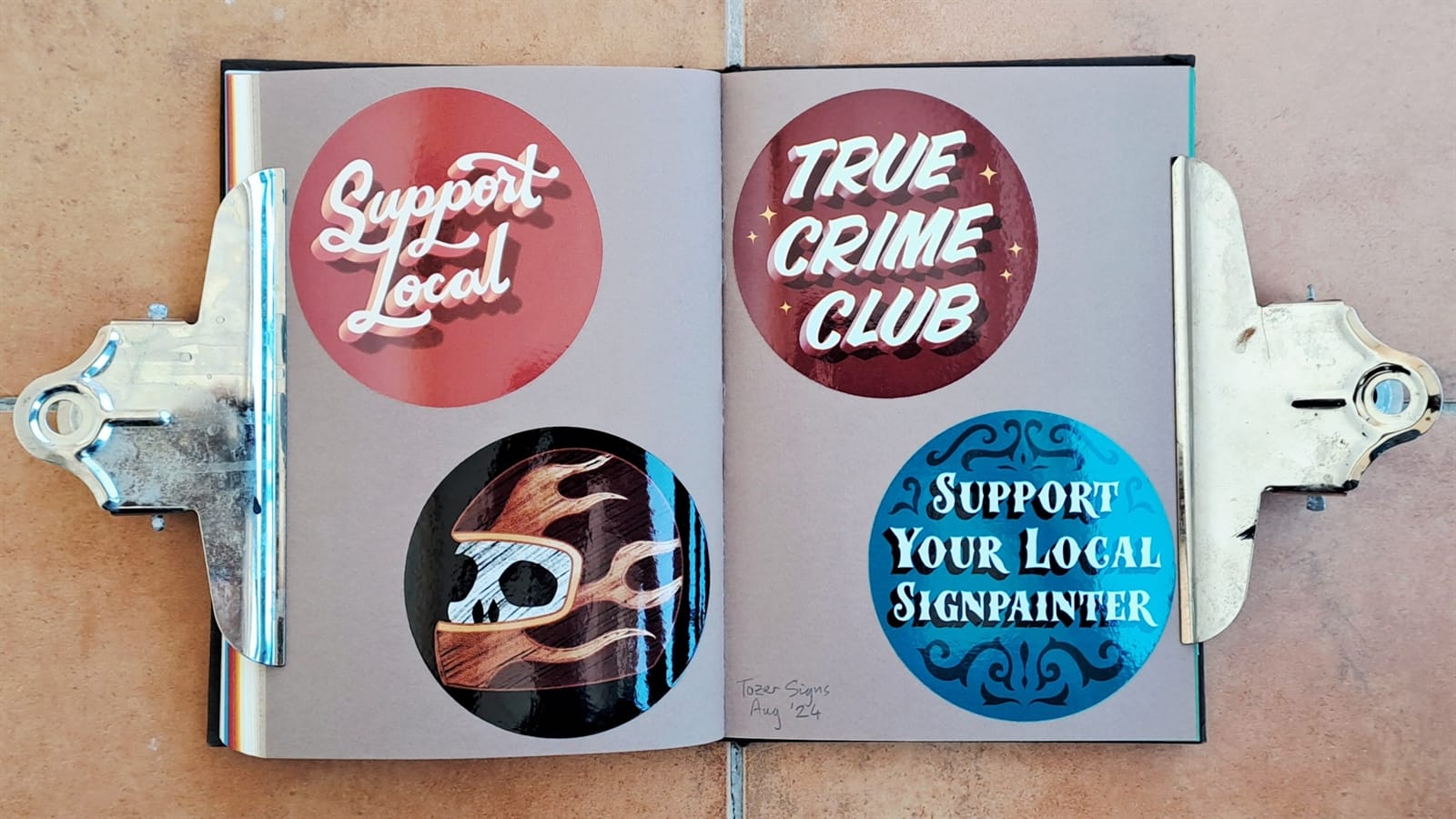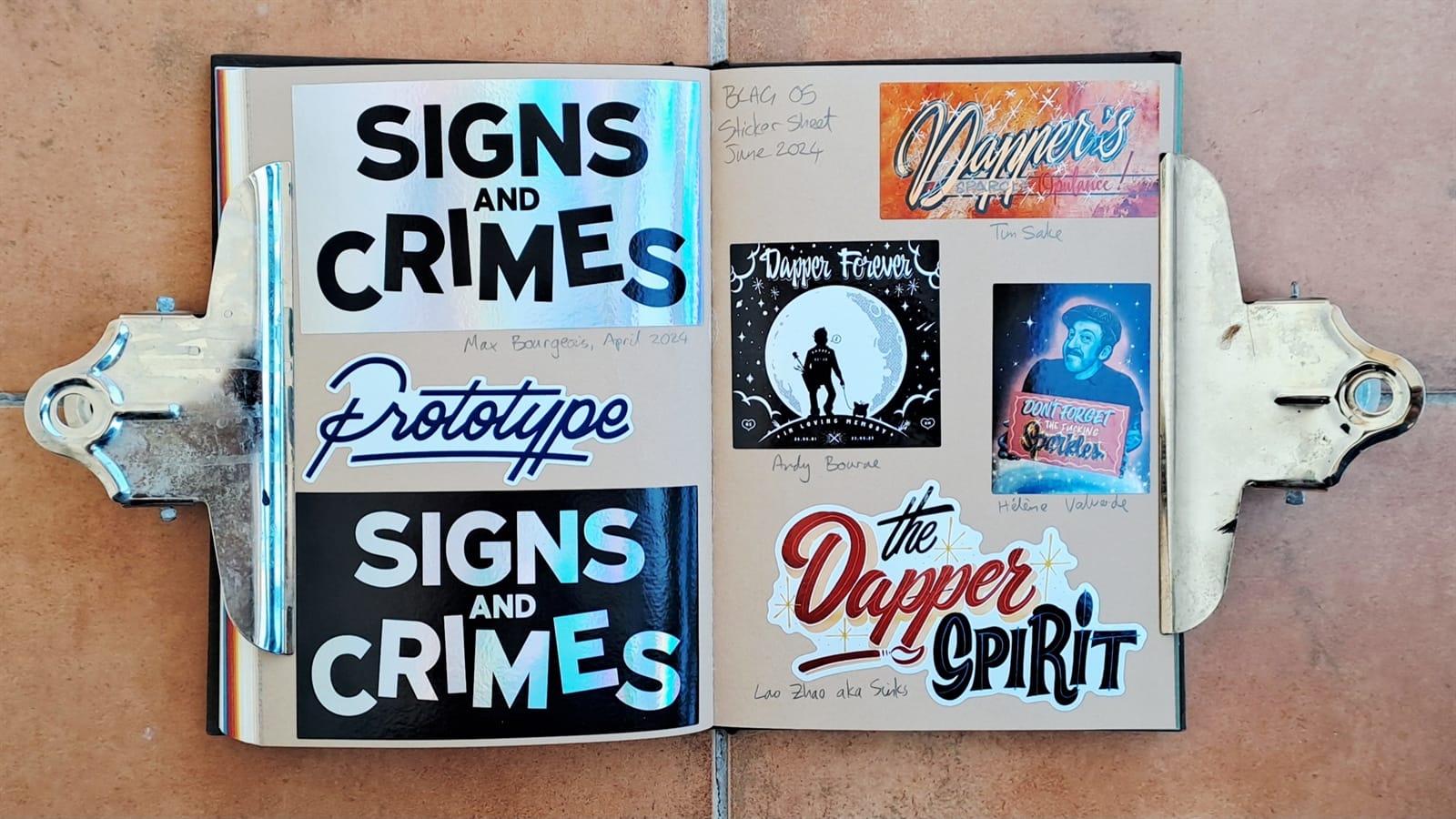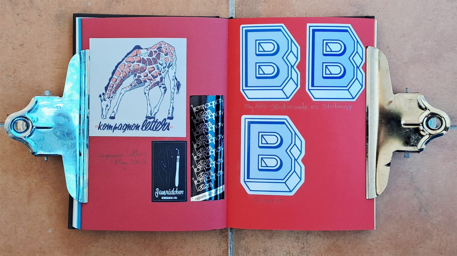Final Letterheads 50 stickers from Puget Sound Signs (left), and two from the Power Tools zine (bottom right).One more Power Tools zine sticker and then the full sheet, plus bonus stickers, from Tom Vincentie, received last week.Next up is this spread (and six more after that) which I hope to have filled on my return from Letterheads 2026: Sea Level....