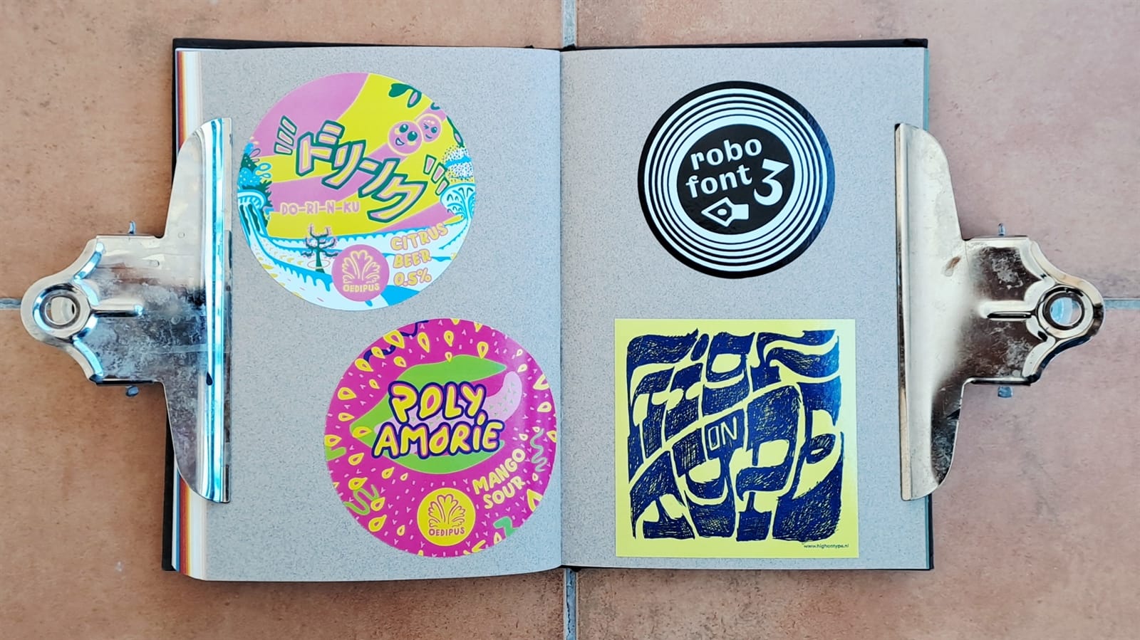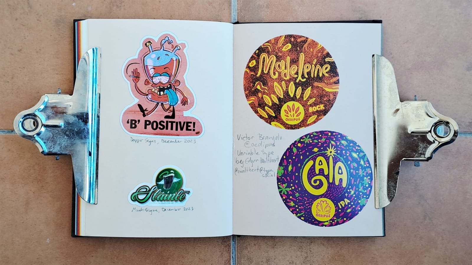 One more Dapper Signs original, ‘Sláinte’ (cheers) by Much Signs, and then a series designed by Victor Brangolo for Oedipus Brewery using variable fonts from Edgar Walthert. The last page is a Robo Font sticker and one from High on Type, both sent to me by Edgar with the brewery ones.
