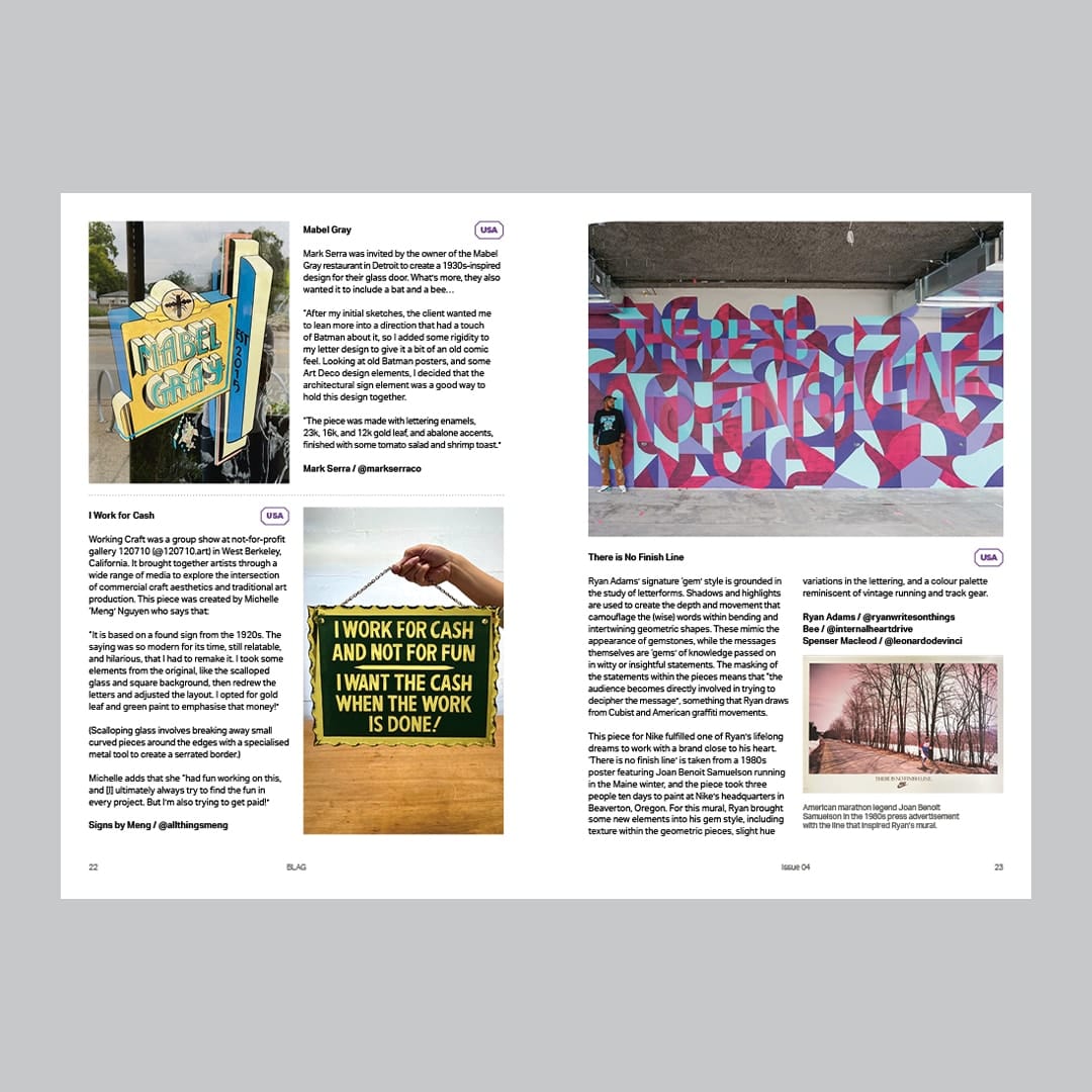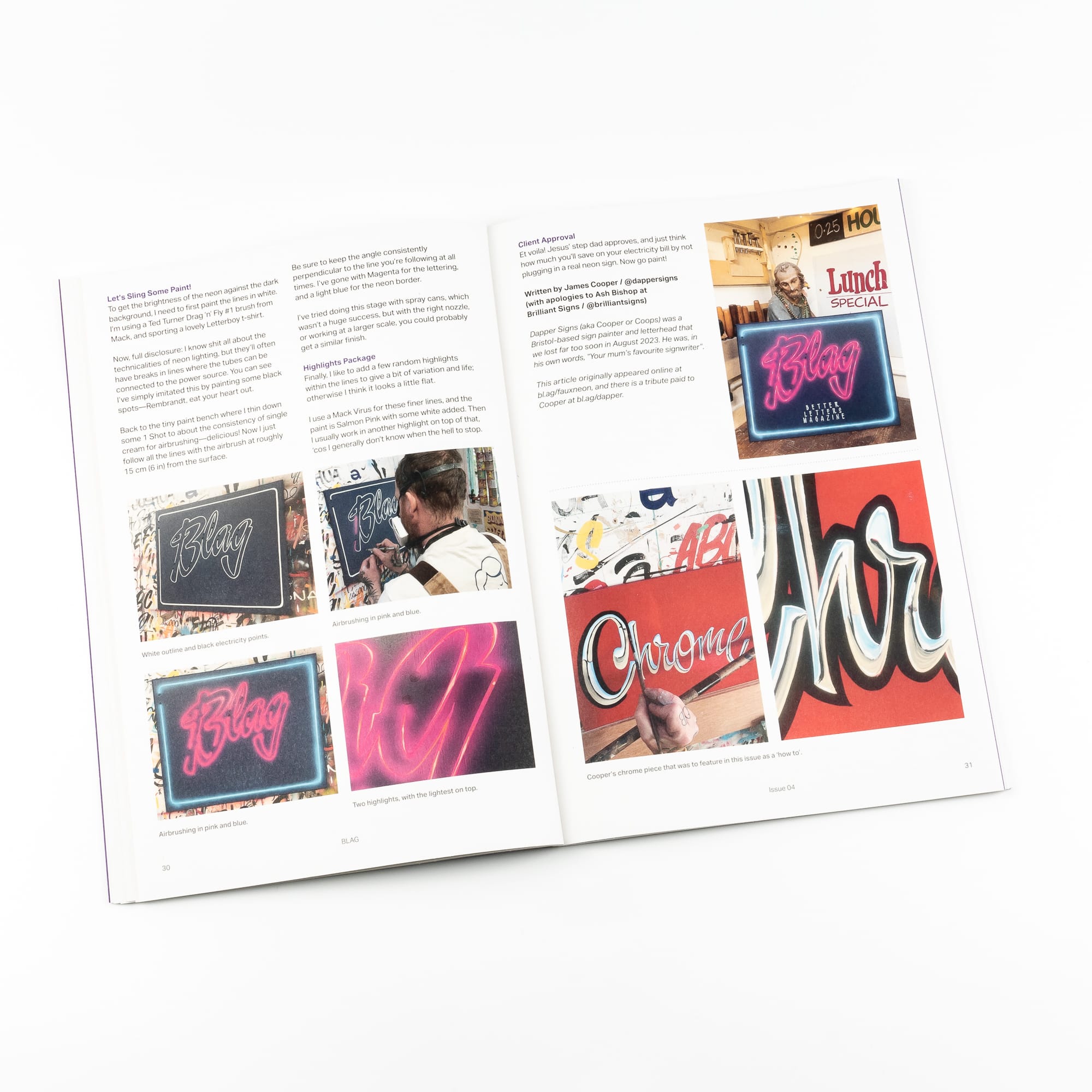 Between the covers of the adventures in sign painting in Issue 04 of BLAG (Better Letters Magazine).