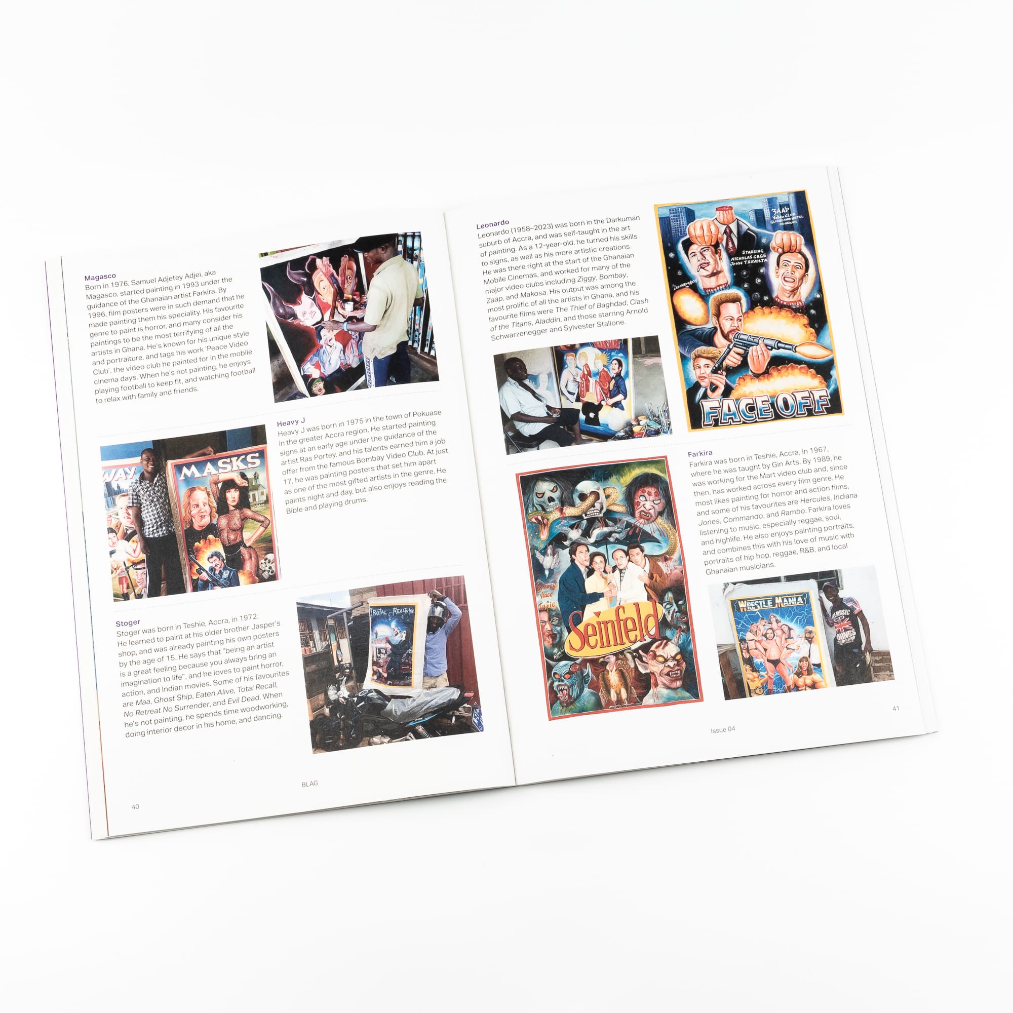The cover shows the Ghanaian sign painter Stoger working on a commission for a tattoo parlour in Australia in collaboration with Chicago's Deadly Prey Gallery. The gallery is profiled in one of BLAG 04's main features, which tells the story of a commercial artform that emerged alongside Ghana's mobile cinemas in the 1980s.