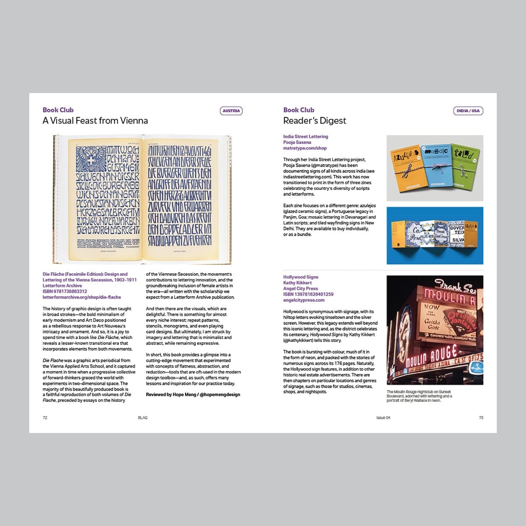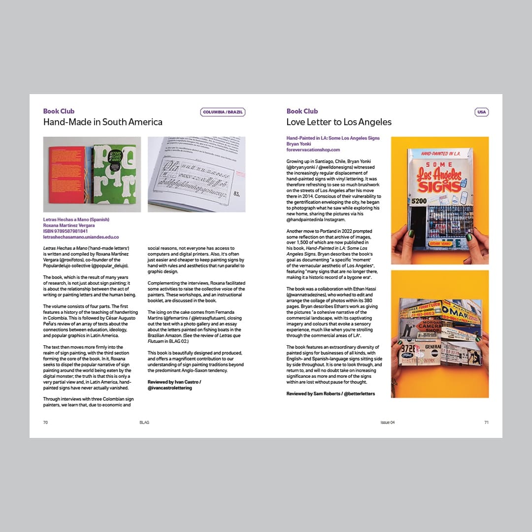 'Book Club' in BLAG 04, featuring: Letras Hechas a Mano by Roxana Martinez Vergara; Bryan Yonki's Hand-Painted in LA: Some Los Angeles Signs; Die Fläche from Letterform Archive; Pooja Saxena's India Street Lettering zines; and Hollywood Signs by Kathy Kikkert.
