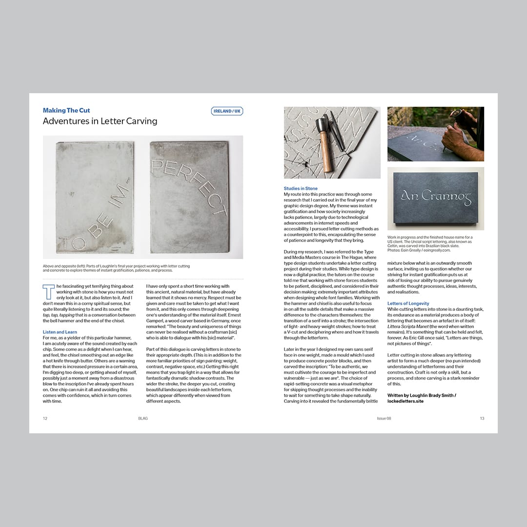 In terms of contemporary practitioners, ‘Shop Talk’ takes us into the field to learn from Greta Lindsay and her work painting for major international music festivals. We also hear how Loughlin Brady Smith’s adventures in letter carving have informed his sign painting work.