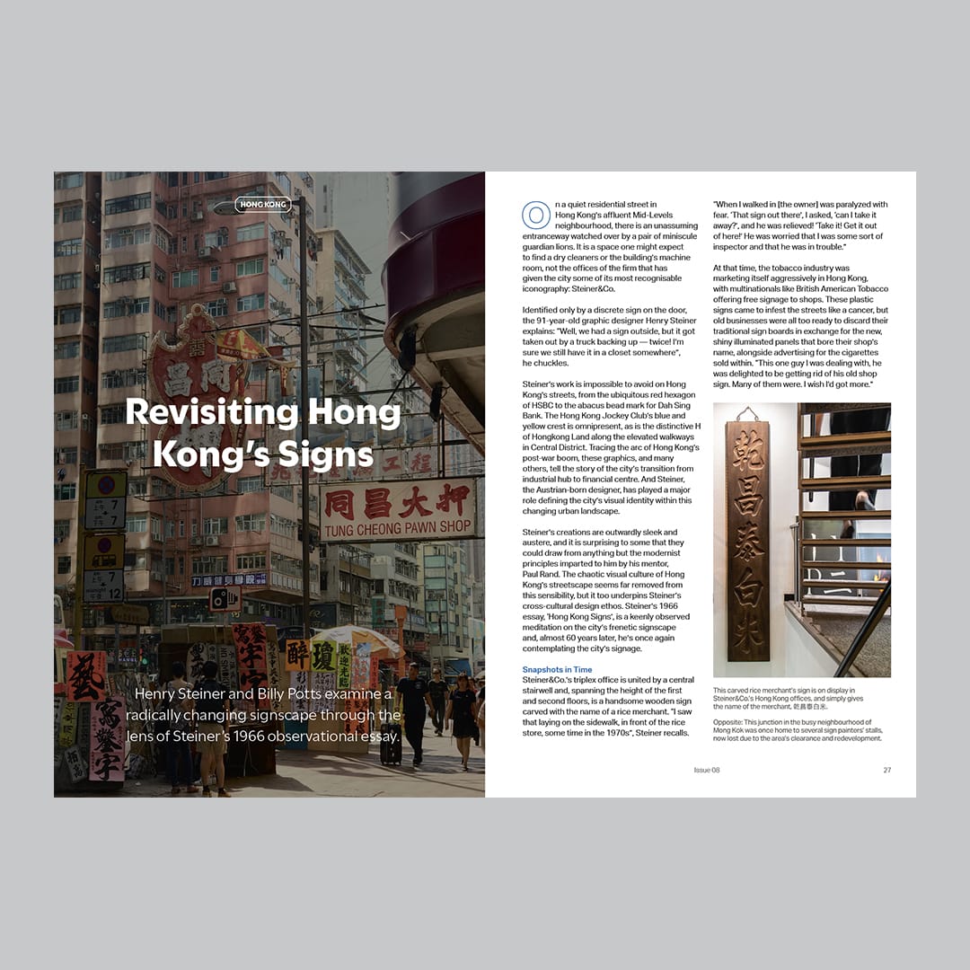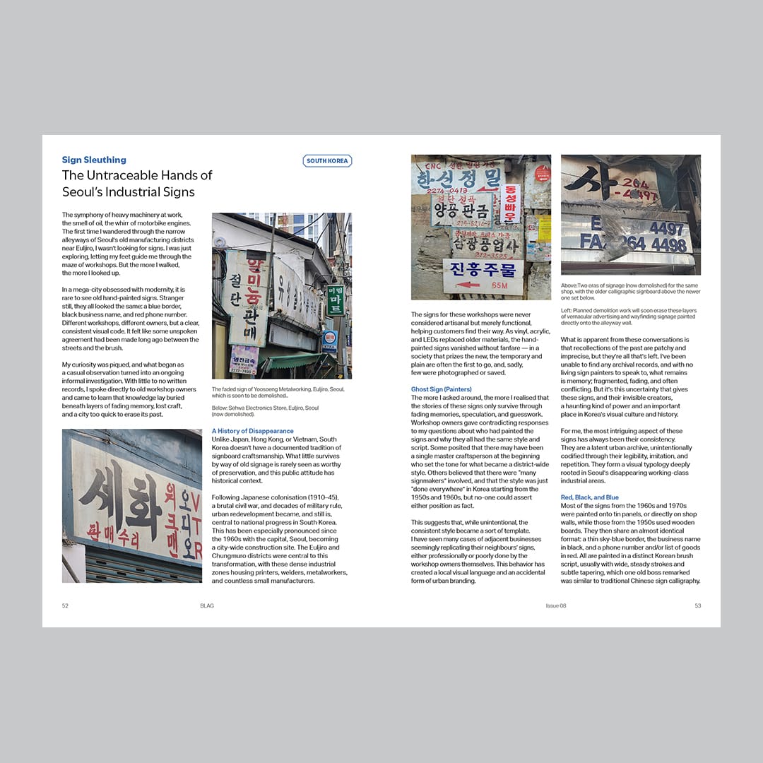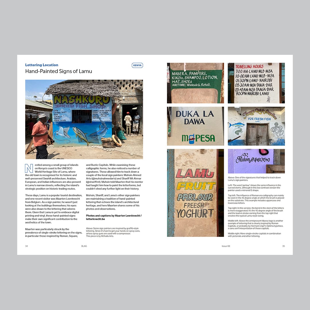 Most BLAG members are based in North America and Europe, but the contents of the magazine are far from restricted to these locations. One of this issue’s main features examines the changes in Hong Kong’s renowned signscape through the eyes of Henry Steiner, nearly 60 years after his 1966 essay on the subject. Luisa Cools then details her research into the characteristic signs found in Seoul’s industrial districts, while Maarten Leenknecht takes us to the world heritage site of Lamu, Kenya, to share his observations on the hand-painted lettering he found there.