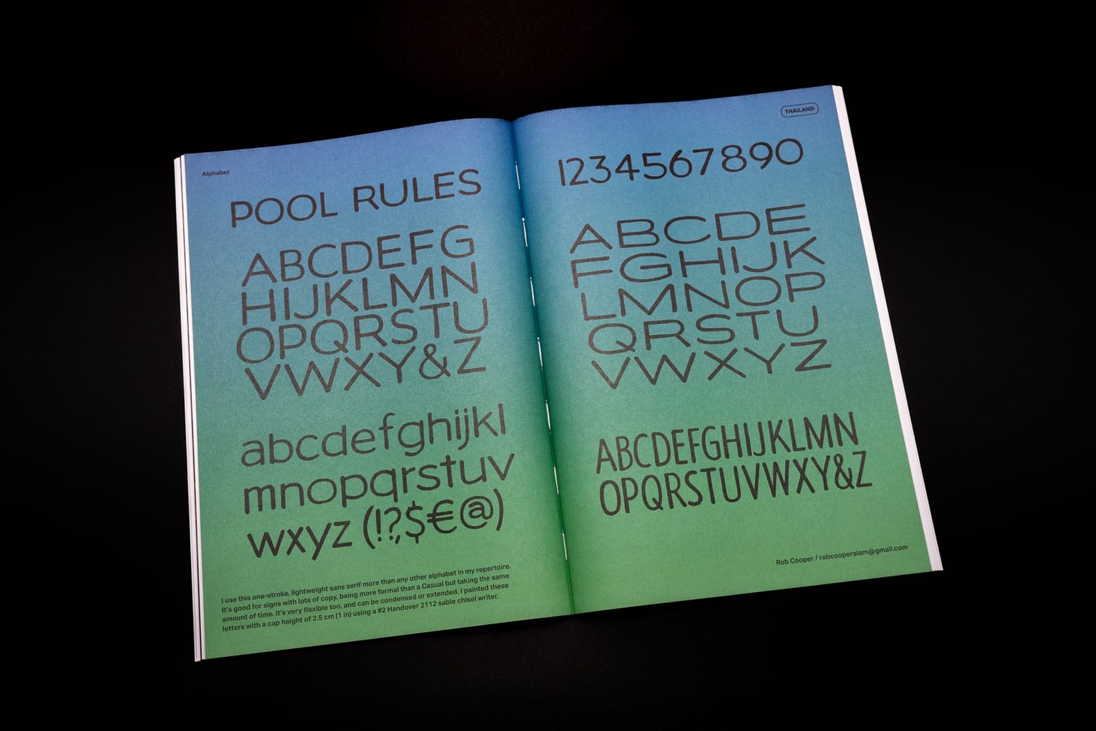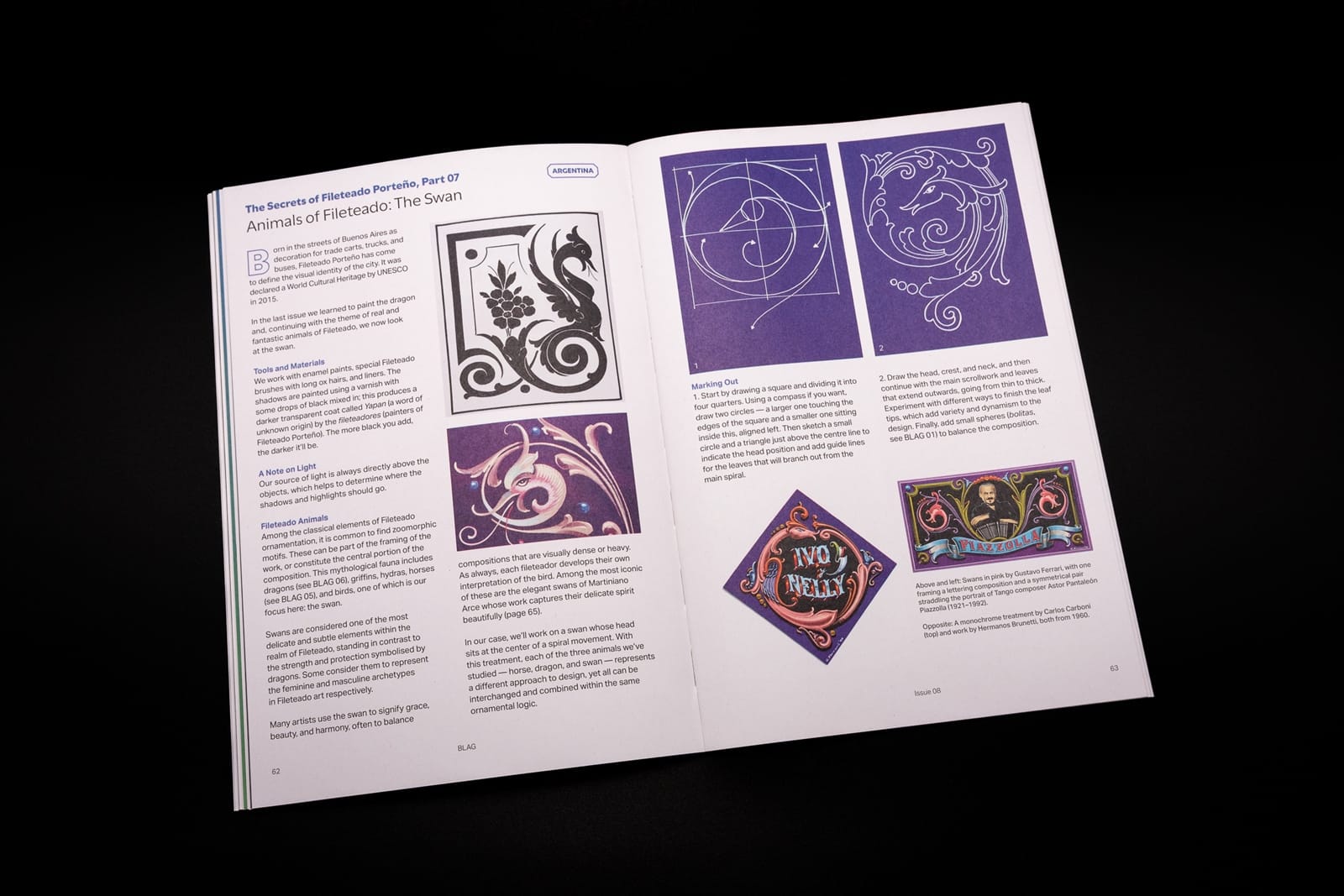 The centre spread brings you a new alphabet — Pool Rules — with variants to play with, and the latest secret of Fileteado Porteño is how to paint the swan. There’s then your usual dose of ‘Sundries’ with the introduction of more Kitbox Krew characters and a very important take on the regular ‘Wise Words’ piece.